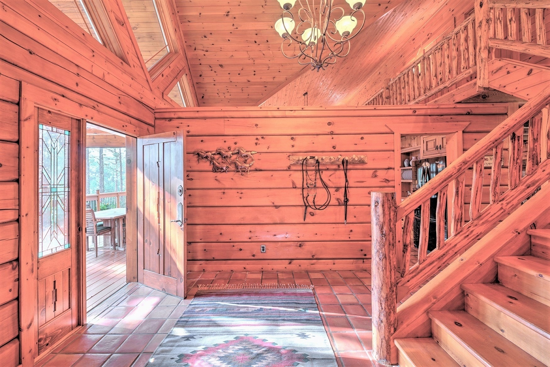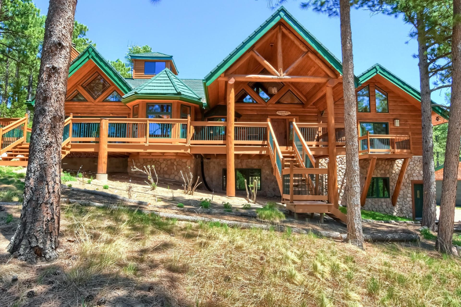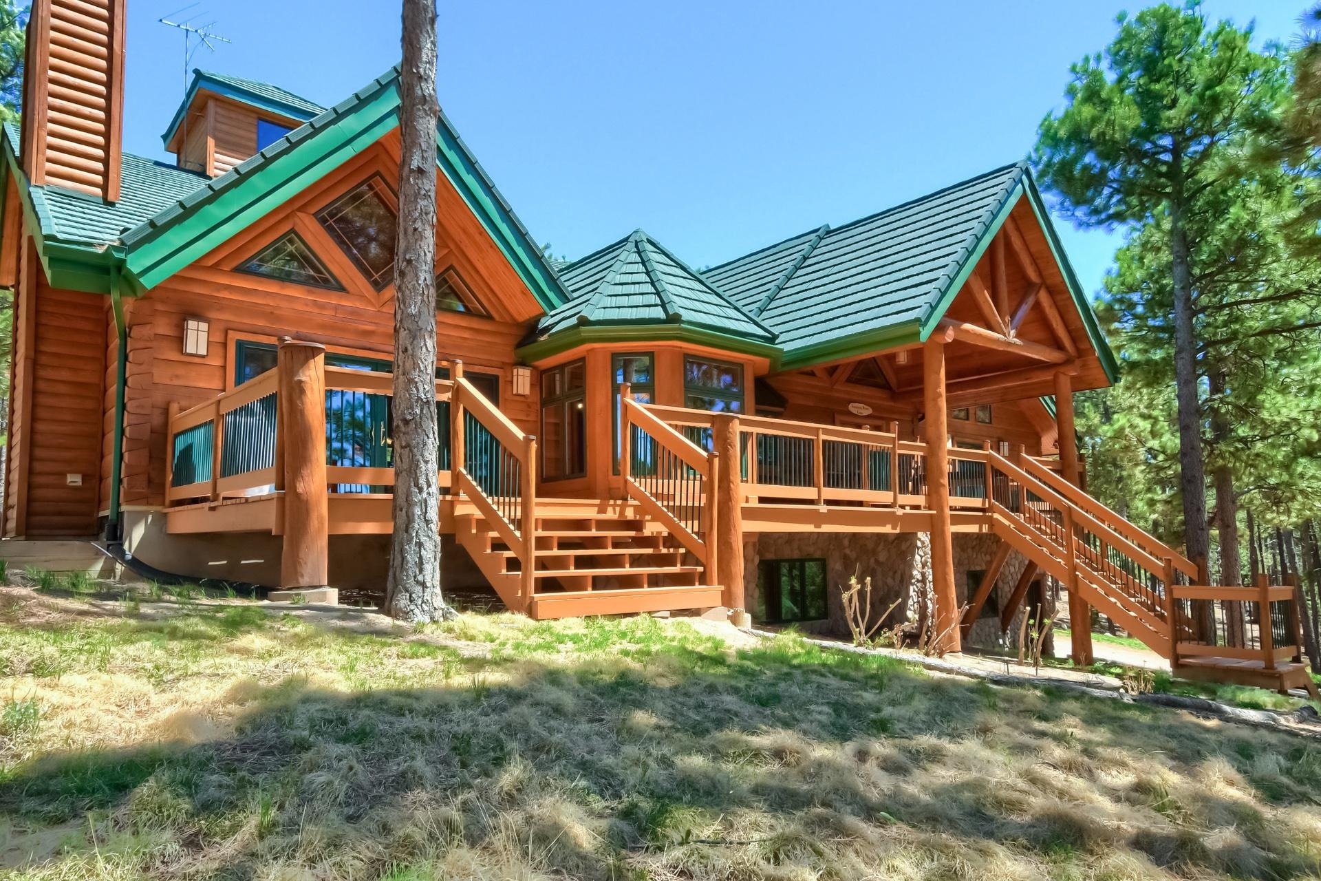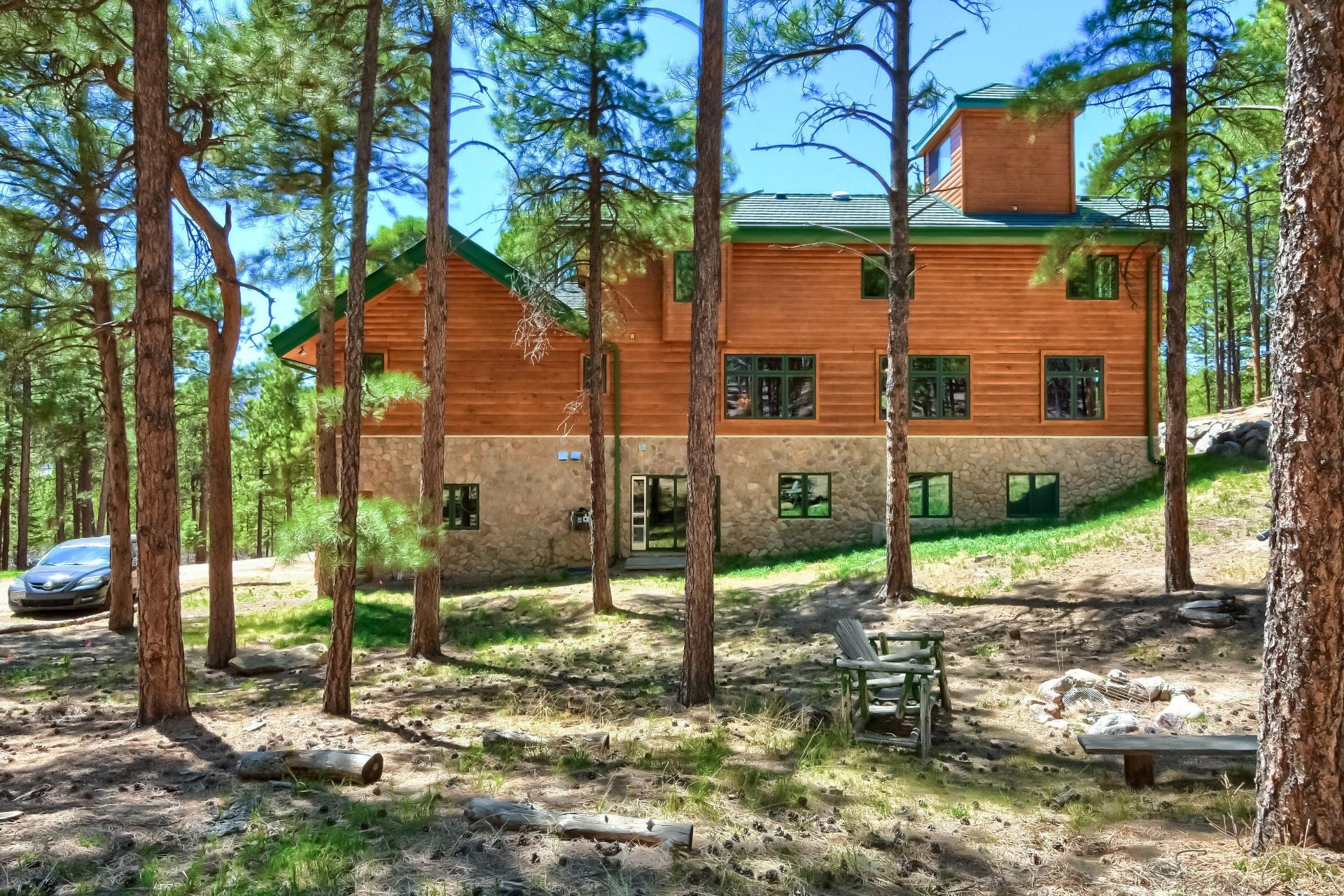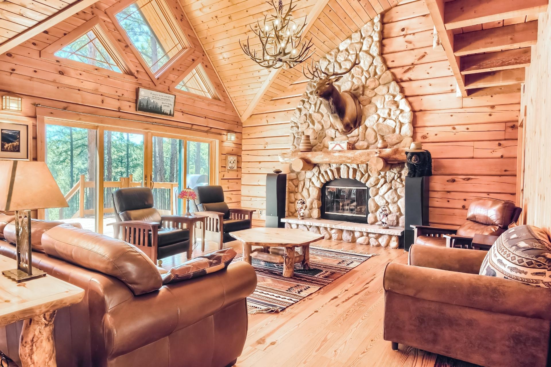 Welcome to this Custom Premier Log Home by respected builder True North Log Homes, with an Interior as Impressive as the Exterior of this Gorgeous Home. The Vaulted Foyer invites you in to an Open Floorplan, Abundant Natural Light and Premier Double Tongue and Groove Pine Walls and Ceilings, and Wood Beams all adding Charm and Warmth throughout the Home. Main level offers a Living Room and an Informal Dining area has Large Windows and an Arched River Rock doorway adding Unique character, and Gleaming Heart Pine Wood Flooring leading you into an Exceptional Sunfilled Great Room. With Vaulted Ceilings, a Floor to Ceiling River Rock Wood Burning Fireplace with a Log Mantel and a Hearth, Mountains and Elephant Rock Vistas through the Double Sliders with access to the Expansive 50' Front Deck, it is Perfect for Entertaining and Relaxing while enjoying the Secluded and Serene Forest with Majestic Pine and Fir Trees and plenty of Wildlife to watch.
