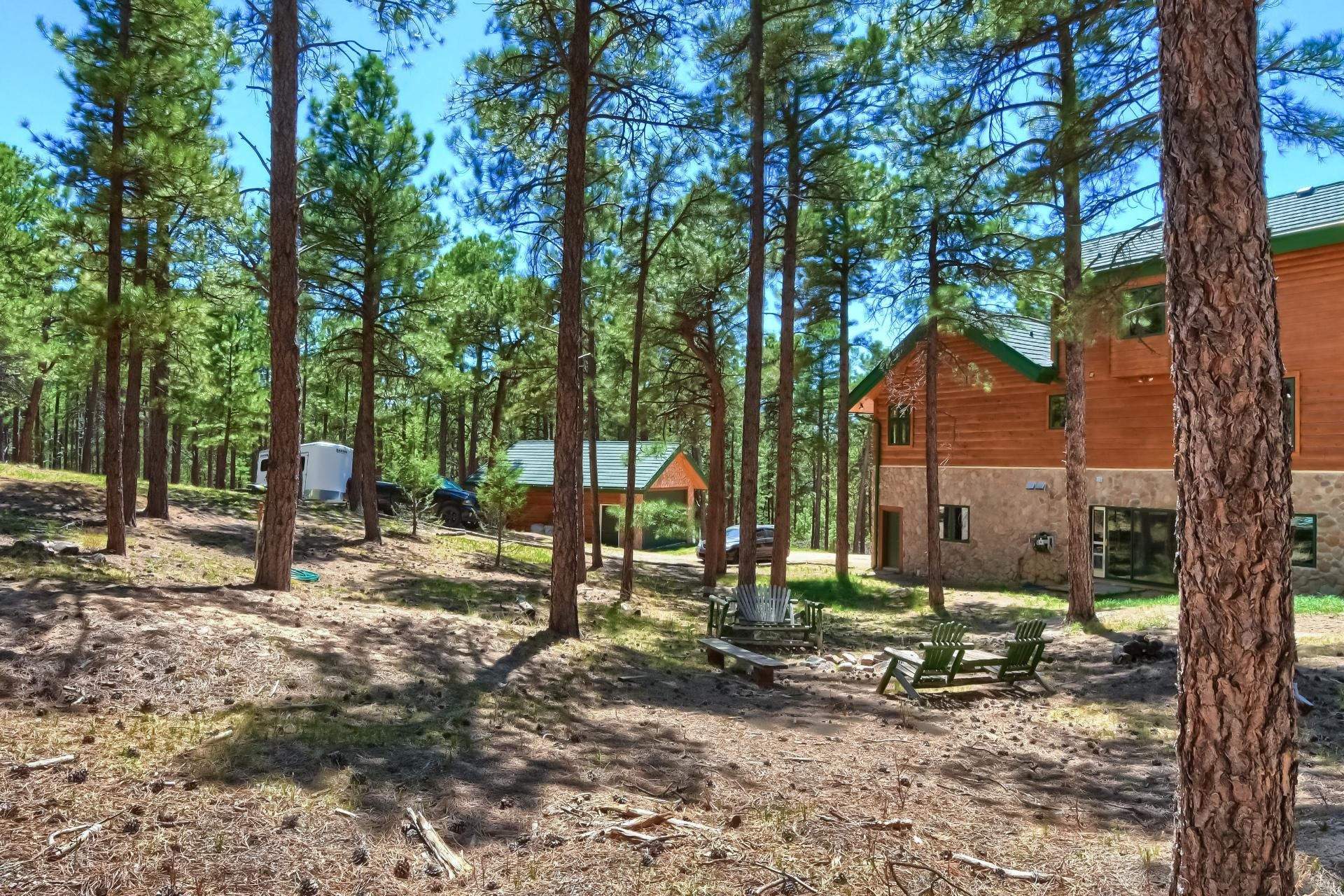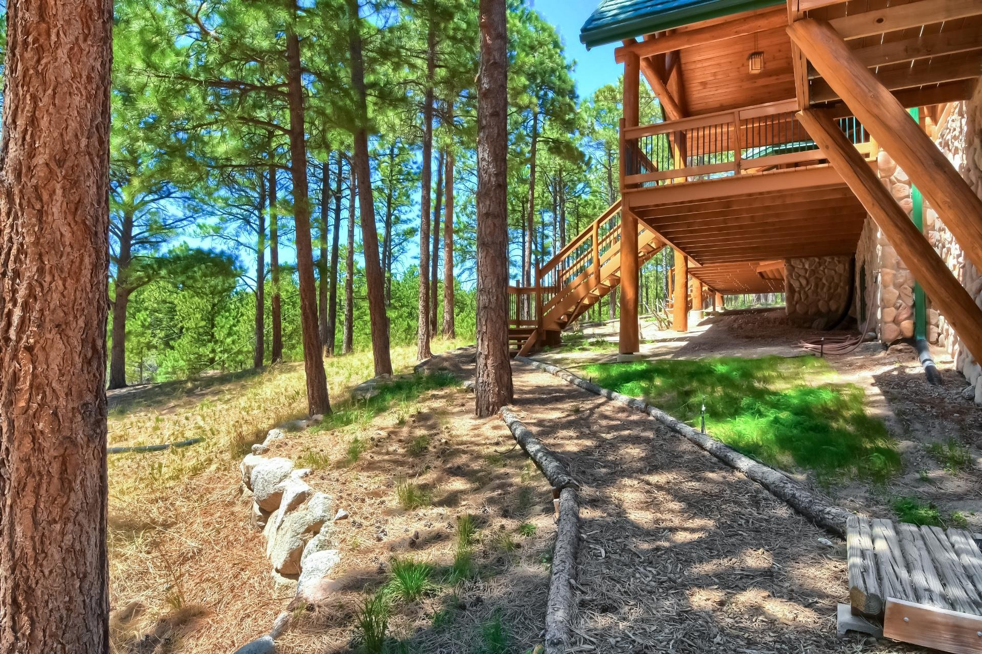 Step up the Hewn Knotty Pine Staircase to additional Living Spaces in the Loft with a Spiral Staircase leading up to a Bright Crow's Nest with the most Amazing Picturesque Views and is Ideal for Stargazing. Upper Level includes 2 Vaulted Bedrooms and a 3/4 Bath with a Granite Vanity, 2 Sinks and a Walk-in Shower. Plenty of Space for Expansion and Extra Storage in the 1,846 SqFt unfinished Walk-out Basement has access to the Backyard and to the 3 Car Garage. Over-sized Detached 2 Car Garage has Exterior Access Doors, Windows and Electricity. Main Level Radiant Heated Floors. RV/Boat Parking allowed. No HOA. Only 3 Miles to Monument with Shopping, Dining, Retail and Palmer Lake with more Dining choices, Palmer Lake Recreation Open Space and hiking at Santa Fe Trail. More Open Space choices only 10 Minutes away. Close to high performing Lewis-Palmer schools. Quick Easy access to I-25 and Hwy 105.